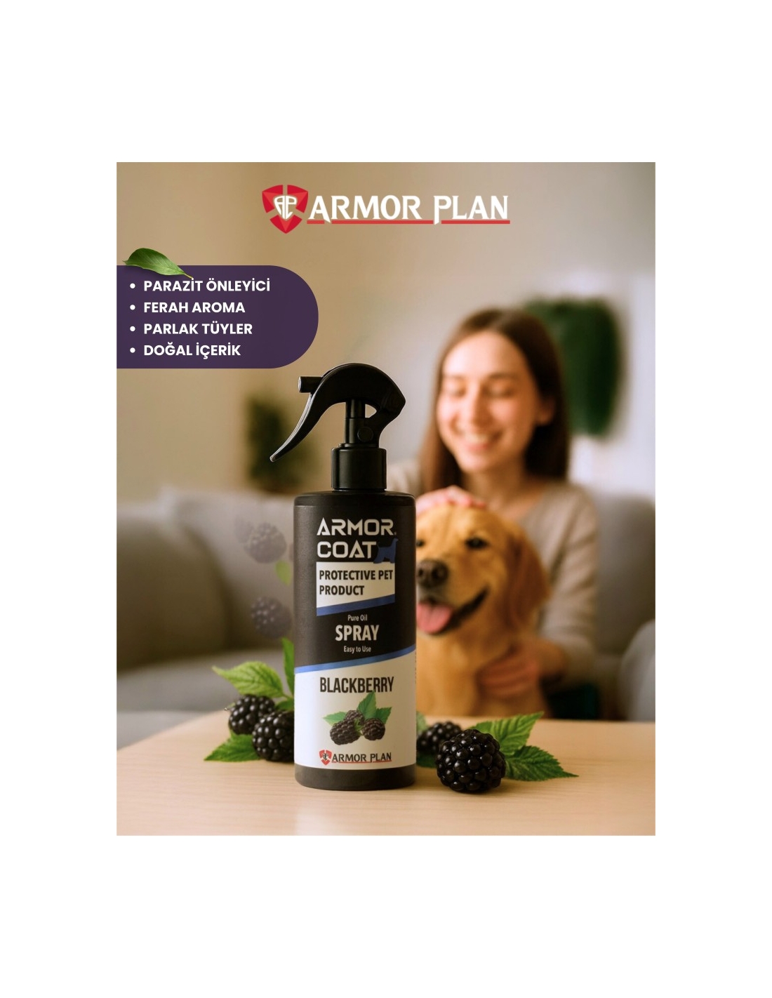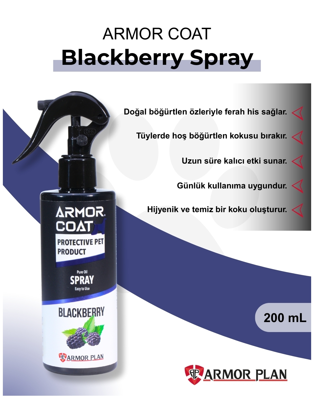 Hedefi hayvan sağlığını koruma planı olan ARMOR PLAN’ın klinik araştırmalar ve saha tecrübeleri ile elde edilmiş formülü ARMOR COAT Blackberry Spray ile köpeklerinizde kötü kokuların doğal yağlar ile giderilmesi, tüylerde parlaklık, tüy dökülmelerinin azaltılması ve giderilmesi, aynı zamanda dış parazit tedavilerine destek olunması amaçlanmıştır. Parazit ile mücadelenin yanı sıra böğürtlen aroması ve yağının köpeklerin kötü kokuların giderilmesinde etkin olduğu gözlemlenmiş olup, aynı zamanda klinik çalışmalardan yola çıkılarak sahiplerin tercihlerinden önce köpeklerin sevebileceği kokular arasında olduğu ortaya konulmuştur.
