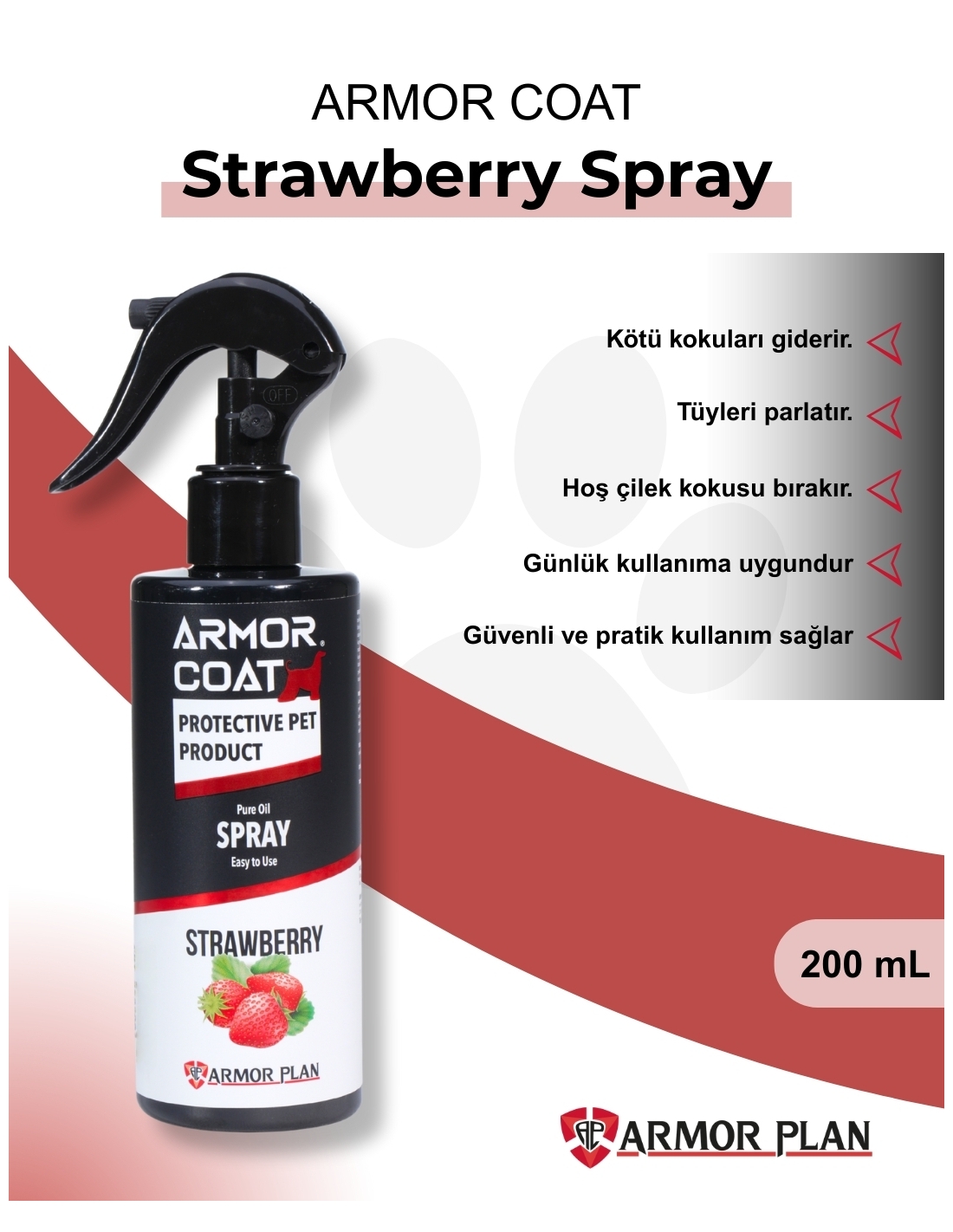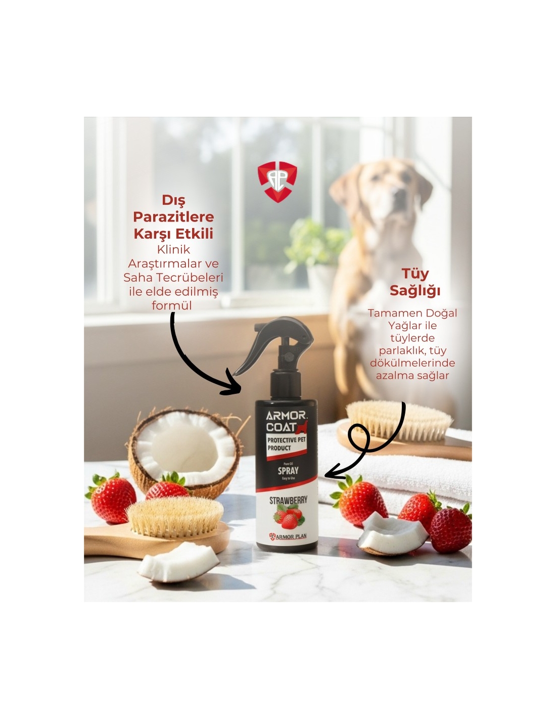 ARMOR COAT Strawberry Spray içeriğinde klinik çalışmalar referans alınarak dış parazitle mücadelede etkin rol oynayan Hindistan cevizi yağı kullanılmıştır.