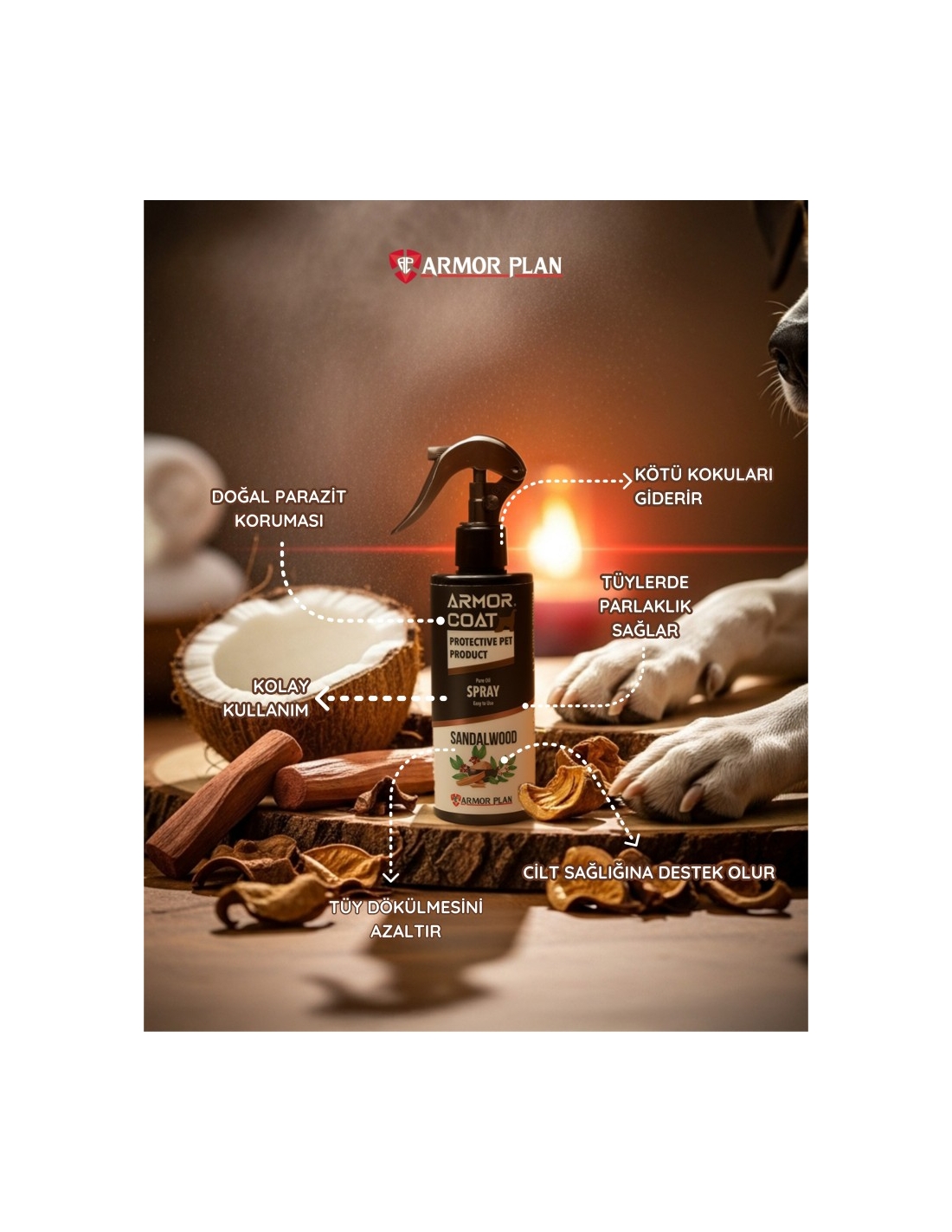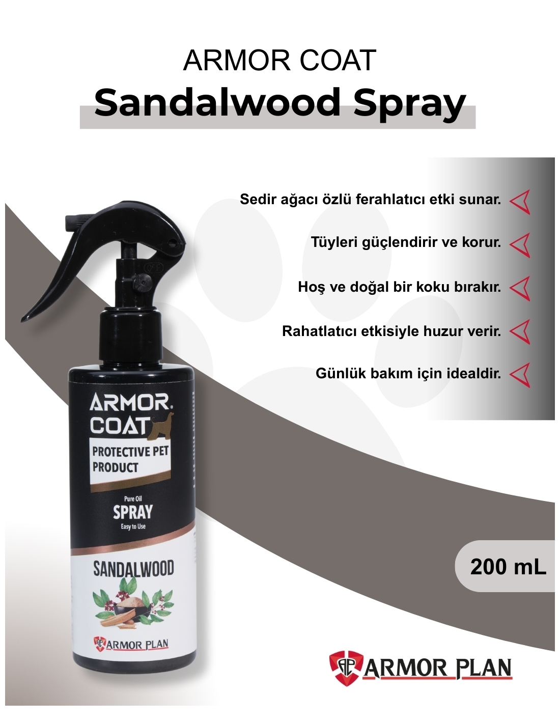 Hedefi hayvan sağlığı koruma planı olan ARMOR PLAN'ın klinik araştırmalar ve saha tecrübeleri ile elde edilmiş formülü ARMOR COAT Sandalwood Spray ile köpeklerinizde kötü kokuların doğal yağlar ile giderilmesi, tüylerde parlaklık, tüy dökülmelerinin azaltılması ve giderilmesi, aynı zamanda dış parazit tedavilerine destek olunması amaçlanmıştır. Parazit ile mücadelenin yanı sıra sandal ağacı aroması ve yağının köpeklerin kötü kokuların giderilmesinde etkin olduğu gözlemlenmiş olup, aynı zamanda klinik çalışmalardan yola çıkılarak sahiplerin tercihlerinden önce köpeklerin sevebileceği kokular arasında olduğu ortaya konulmuştur. Sandal ağacı yağının en önemli özelliklerinden biri ise cilt üzerinde oluşan tümörlerin giderilmesinde aktif rol oynamasıdır.